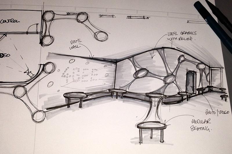 Taking an initial concept, working for Firecracker Works, I created sketches and visuals for 3 proposed hospitality suites for a high street brand. Using hand sketches, Vectorworks drawings and Cinema 4D visuals the client was able to quickly sign off the designs. From this point detailed construction drawings were produced for build in the workshop and construction on site.